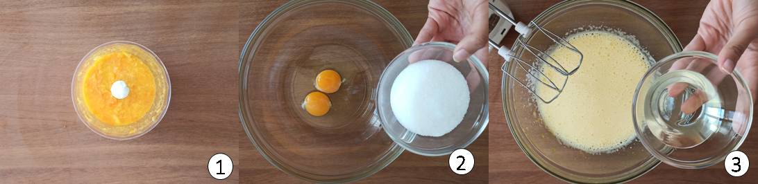 Pela le arance con un pelapatate in modo da prendere solo la parte arancione e non quella bianca. Elimina tutta la parte bianca dalle arance e gli eventiali semi. Metti quindi tutta la polpa (circa 200g) nel frullatore, aggingi la buccia tagliata a grossi pezzi e frulla tutto fino ad ottenere una purea liscia. Metti in una ciotola le uova con lo zucchero. Monta bene con l’aiuto delle fruste elettriche. Aggiungi quindi prima l’olio di semi a poco a poco e poi la polpa frullata mescolando bene con le fruste elettriche.